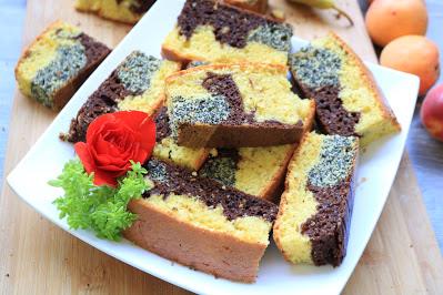 Jedan deo ostaje žut i u njega staviti koricu limuna, u drugi deo kakao a u treći mak. Svaki deo dobro izjednačiti. Pleh 30x20 podmazati maslacem ili obložiti pek papirom.