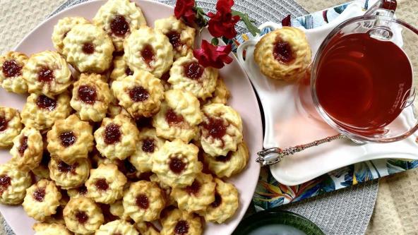 Izmiksirati puter, dodati šećer i belanca pa nastaviti miksiranje. Dodati kap do dve ekstrata vanile, i brašno. Sjediniti sve. Takvu smesu staviti u špric, i po plehu na koji smo stavili pek papir praviti oblike. Probušiti centar i staviti malo domaćeg džema. Peći na 200 stepeni 12-15 minuta. Prijatno!