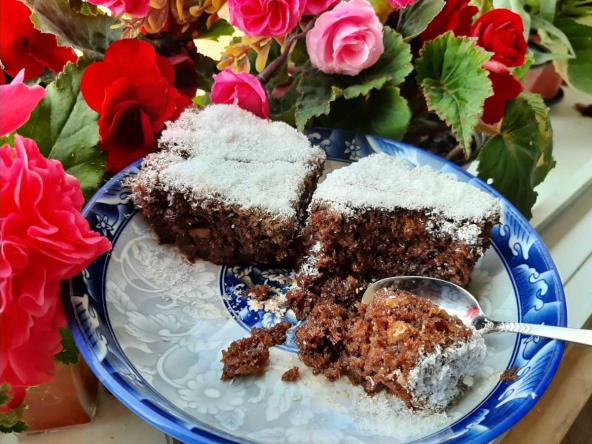 Umutite jaja sa šećerom, pa dodajte brašno sa praškom za pecivo, ulje, mleko, rastopljenu čokoladu, suvo grožđe, seckane orahe i sve dobro izjednačite. Pleh podmažite, pa izlijte kolač i pecite na 200°C 30-40 min. Pečen kolač isecite na kocke. Skuvajte mleko sa vanilin šećerom, čokoladom i šećerom po želji, pa ohladite. Prelijte kolač da upije, pa pospite kokosom.