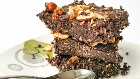 Priprema: Istopite na pari puter i čokoladu, dodajte koricu limuna i ekstrakt vanile. Umutite u posebnoj posudi jaja, pa dodajte kakao i zaslađivač po želji. Sipajte istopljenu čokoladu u posudu sa jajima i dodajte bademovo brašno. Stavite smesu u nauljen pleh, preko toga dodajte izmrvljenje lešnike ili orahe. Pecite 15 minuta na 180°C.