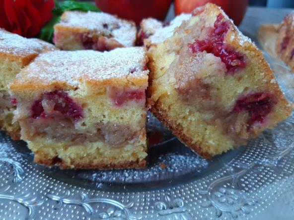Uključite rernu na 200°C. Omekšajte maslac, dodajte šećer u prahu i prašak za pecivo, pa umutite mikserom. Zatim dodajte brašno, koricu limuna, ulje i mleko i sve sjedinite. Jabuke izrendajte, pa dodajte šećera i cimeta po želji. Neka malo odstoje, pa ocedite sok. Pleh obložite pek papirom ili podmažite uljem i sipajte pola testa. Ubacite rendane oceđene jabuke, a preko rasporedite maline. Sipajte ostatak testa preko malina i izravnajte. Rernu smanjite na 190°C i pecite sat vremena, ako treba i duže da lepo porumeni. Kolač potpuno ohladite, pa secite.
