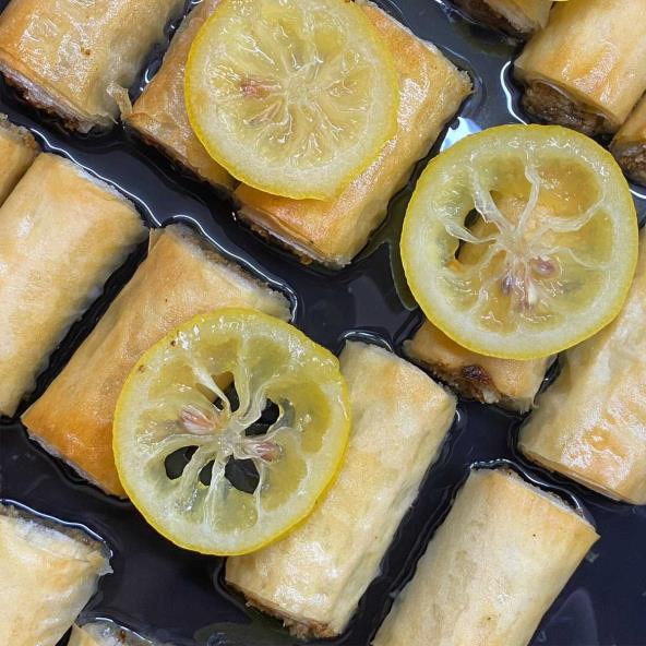 Sjediniti sve sastojke za fil. Zatim početi sa uvijanjem kora po principu dve kore premazati margarinom i uljem, pa staviti fil zatim urolati i tako sve dok imamo materijala. Rolatiće seći na manje delove i redjati u pleh za pečenje. Peći na 200 stepeni 20-25minuta. Preliv napraviti tako što u vodu dodamo šećer i isečen limun i od tačke ključanja kuvamo 15-20min na umerenoj temperaturi. Hladne pečene baklave preliti vrućim prelivom. Prijatno!