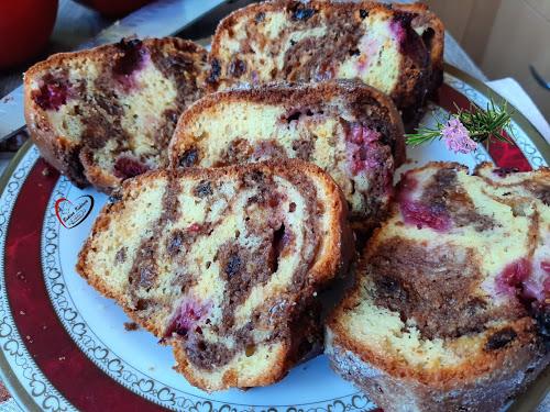 Umutite jaja sa šećerom, dodajte brašno sa praškom za pecivo, suvo grožđe sa koricom limuna, vanilin šećer i rum šećer, jogurt i ulje i sve izjednačite. Podelite smesu na manji i veći deo. U manji deo dodajte rastopljenu čokoladu i sjedinite. Kuglof premažite uljem i pospite brašnom. Sipajte 3 kašike svetle smese, pa preko 3 kašike čokoladne smese i opet 3 kašike svetle smese. Preko malo voća i tako ređajte dok ne utrošite sve. Protresite kuglof da se lepo izjednači. Pecite oko sat vremena na 200°C. Kada se potpuno ohladi izvadite. Pospite prah šećerom po želji i vanilin šečerom.