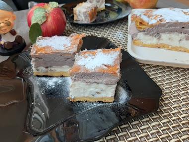Priprema: U šerpu sipajte 200 ml mleka, dodajte kocku maslaca ili margarina i pustite da provri. U provrelo mleko dodajte brašno sa praškom za pecivo i koricom limuna i dobro promešajte. Smesa treba da bude baš gusta. Prohladite. Dodajte po jedno jaje i mešajte varjačom ili mikserom da se izjednači dok smesa ne postane glatka. Pleh 30x20 cm obložite pek papirom i sipajte pola smese i raspodelite po dnu pleha. Pecite 25 min. na 200°C. Ispecite 2 kore. Skuvajte puding sa malo šećera (1 kašika šećera i 1 kesica vanilin šećera). U vreo puding dodajte 100 g suvog grožđa. Ostavite da se prohladi. Omekšali puter umutite i sjedinite sa pudingom kao u videu. Šlag umutite po upustvu iz kesice. Na prvu koru stavite celu smesu pudinga i lepo razvucite odozgo šlag i poklopite drugom korom. Pritisnite i stavite u jednu kesu i držite u frižideru ako je moguće celu noć da lepo upije.