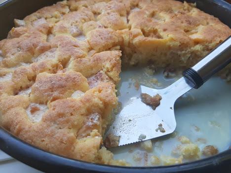 Umutite jaja sa 5 kašika šećera, dodajte griz, plazmu, koricu limuna, suvo grožđe i sve sjedinite. Pleh podmažite uljem i pospite brašnom, pa istresite umućeno testo i preko njega rasporedite sečene breskve. Pecite na 200°C oko 40 min. Mleko skuvajte, dodajte šećer po želji, može i vanilin šećer, pa kad se koh ispeče polako prelivajte dva puta u razmacima da lepo upije.