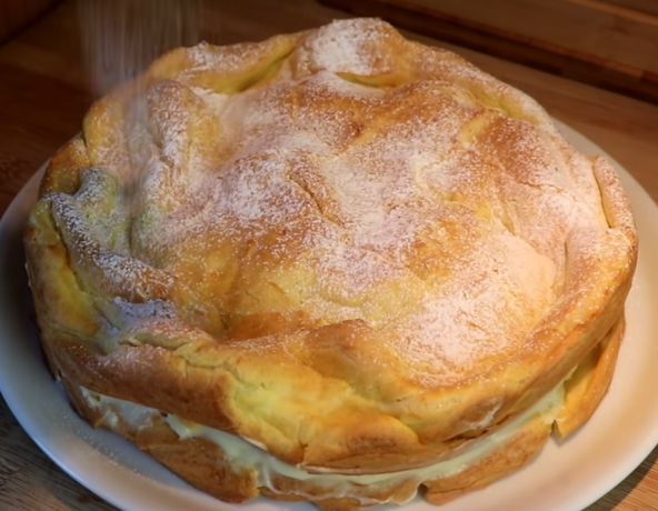 U šerpi otopite puter, pa dodajte mleko i vodu. Zatim dodajte so, pa kada počne da vri sipajte brašno pomešano sa praškom za pecivo. Kad dobijete čvrstu smesu, isključite šporet, prespite u posudu i ostavite da se ohladi. Uključite rernu na 200°C i u testo dodajte 1. jaje, pa promešajte. Isto to uradite sa još 3 jajeta. Dodajete jedno po jedno i mešate. Obložite kalup za tortu od 25 cm pek papirom. Sipajte pola testa i lepo rasporedite po kalupu. Stavite da se peče nekih 10 minuta. Izvadite testo iz kalupa i ponovite postupak sa drugom polovinom.