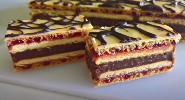 Dva lista male oblande premažite sa 6 punih kašika džema po vašem izboru. Potrebno je i 34 komada četvrtastog keksa. Polovinu poređajte preko jedne kore.