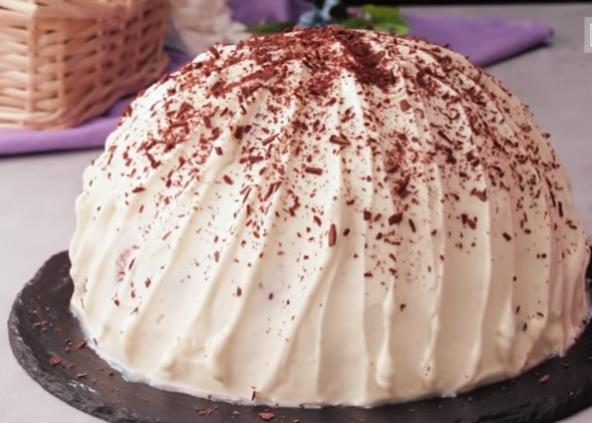 Zatim uzmite tanjir ili neki kalup prečnika 20 cm i izrežite krug u testu. Pavlaku umutite sa prah šećerom. Ostatak testa iseckajte na kockice i prelijte sa pavlakom. Promešajte i ređajte po kružnoj kori u visinu. Stavite u frižider sat vremena da se ohladi. Ukrasite šlagom i čokoladom.