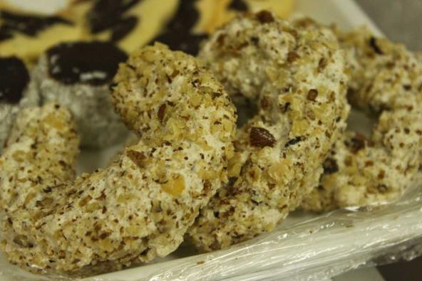3. Veliku tespiju prethodno pripremite, stavite na nju papir za pečenje. Testo podelite na otprilike 50 komada-kuglica. Svaku kuglicu dlanovima formirati u valjak (5 cm), uvaljati u seckane orahe i blago krajeve saviti ka unutrašnjosti da se dobije oblik orasnice kao na slici.