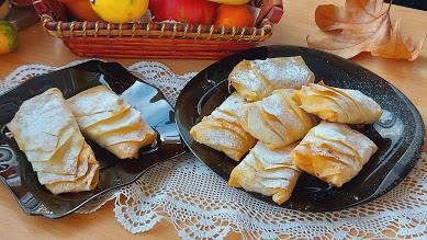 Jabuke izrendati, posuti cimetom, seckanim orasima i suvim groždjem i izjednačiti. Kore isecite da budu četvrtaste, premažite malo uljem i presavijte na pola pa opet još jednom.