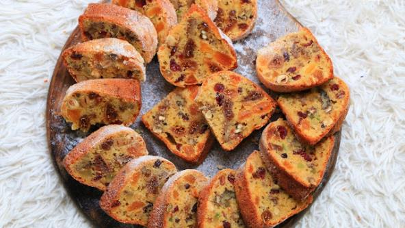 U testo dodajte iseckano suvo voće, suvo groždje i brusnice (ne treba seckati). Orašaste plodove dodajete krupne. Istresite u kalup, poravnajte i pecite oko 45 minuta. Proverite čačkalicom da vidite da li je pečeno.
