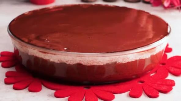 Umutite slatku pavlaku i sipajte preko ohlađene čokolade. Zatim napravite glazuru tako što ćete štapnim mikserom sjedniti šećer, kakao i mleko. Dodajte ulje i još malo mutite. Prelijte preko šlaga i ostavite da se stegne u frižideru 3 sata.