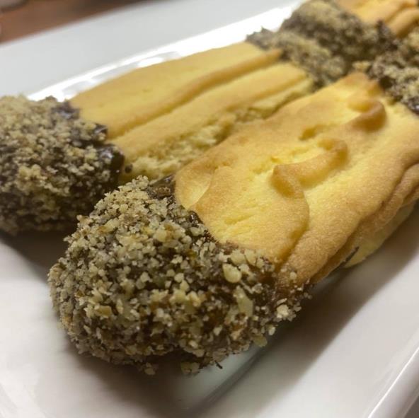 Izmiksirati margarin, dodati prah šećer i nastaviti miksiranje. Dodati brašno i prašak za pecivo i sjediniti. Umesiti rukom pa smesu ubaciti u špric za tulumbe. Praviti oblike i peći na 180 stepeni 10 minuta. Kolače spajati džemom pa umakati ivice u čokoladu pa u orahe. Prijatno!
