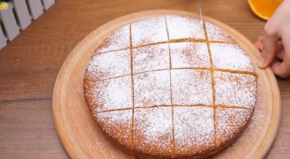 Koru od pomorandže izrendajte, a nju iscedite. Puter sobne temperature pomešajte sa šećerom i vanilin šećerom, pa umutite. Dodajte jaja, pa nastavite da mutite. Zatim dodajte koru i sok od pomorandže. Brašno pomešajte sa praškom za pecivo, pa dodajte u prvu smesu i umutite testo.
