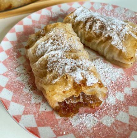 2. Jednu koru raširite, premažite uljem, zatim drugu pa i nju premažite uljem, i tako do četiri. Na četvrtu po kraćoj dužini stavite trećinu količine jabuka. Rolajte da dobijete “štap”. Krajeve prstima nagurajte unutra da jabuke ne iscure. Isecite “štap” na 4 dela ( ili više po želji). Slažite u pleh, vatrostalnu posudu, kako vam volja. Postupak ponovite i za ostala dva “štapa”.