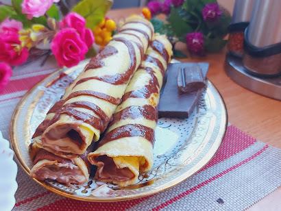 U kesu sipati čokoladni deo, probušiti malu rupicu na ćošku kese pa na palačinku koja se peče praviti krugove krenuti od centra ili do ivice kako vam je lakše. Čim se malo zapeče okrenuti.