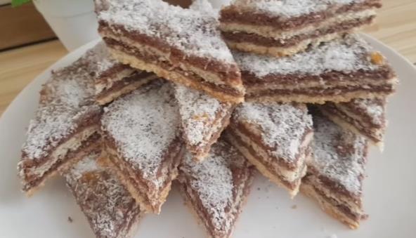 Nauljite pleh za rernu i ravaljajte testo. Slažite prvo belo, pa crno, belo, pa crno. Zatim rukama raširite testo po celom plehu. Izbodite viljuškom i pecite na 180°C 20 minuta. Džem i pomorandžu stavite u šerpu i istopite na šporetu nekih 2 minuta. Premažite koru sa istopljenim džemom. Isecite krajeve da dobijte pravilan pravouganik, pospite kokosom i vaš kolač je spreman.