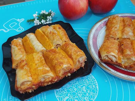 Raširiti koru pa je premazati uljem. Staviti drugu koru preko nje i nju pouljiti. Na dno staviti 3 pune kašike jabuka rasporediti saviti ivice i čvrsto uviti u rolnicu.