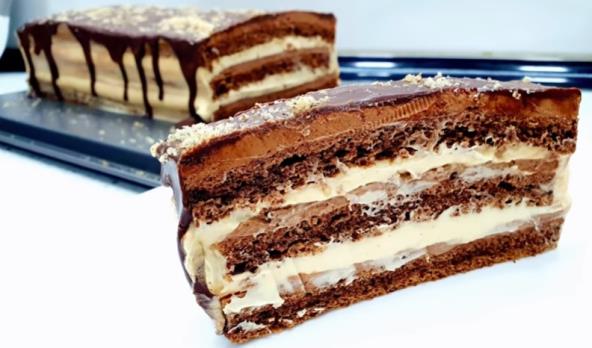 Slaganje torte: Koru podelite na 3 jednaka dela. Svaki deo poprskajte sa malo mleka. Prva kora - čokoladni sloj - žuti sloj, zatim druga kora - čokoladni sloj - žuti sloj, pa treća kora - čokoladni sloj - glazura. Dekorišite mlevenim orasima.