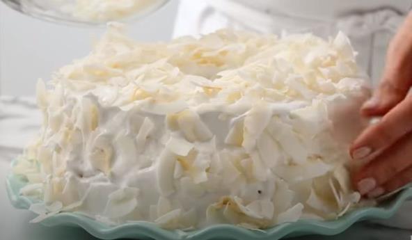 Premažite kremom biskvit, pospite kokosom i prekrijte gornjim biskvitom. Celu tortu premažite ostatkom glazure i pospite kokosom.