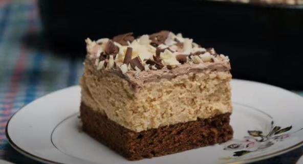 Za drugi fil umutimo šlag krem od čokolade prema upustvu sa kesice. Kada je gotov premazati kolač preko prethodnog fila. Odozgo narendajte belu i crnu čokoladu, pa stavite u frižider da se stegne.