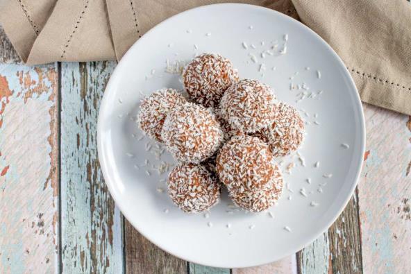 Oljuštite jabuke, isecite na kockice i skuvajte ih sa šećerom, bez vode. Dodajte mleveni keks i cimet. Napravite bombice i uvaljajte ih u kokosovo brašno. Ništa lakše. Prijatno!