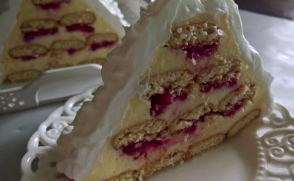 Jaja umutite sa šećerom, pa dodajte gustin, puding od vanile i 50 ml mleka. Umutite. Ostatak mleka (450 ml) stavite da provri, a zatim dodajte smesu sa jajima. Kuvajte dok se ne zgusne uz konstano mešanje, a zatim sklonite sa šporeta i dodajte pavlaku. Promešajte. Kada se fil ohladi umutite, pa dodajte margarin sobne temperature i opet dobro umutite. Dodajte mleko u prahu i sve lepo sjedinite mikserom. Tacnu koju ćete koristiti premažite sa malo fila (samo deo gde će stajati kolač), pa ređajte plazmu (3 reda po 4 keksa) umočenu u mleko. Preko stavite 4-5 kašika fila i poravnajte, a zatim maline presecite na pola i utisnite u fil. Poređajte sledeći red keksa (3 reda po 3 keksa), pa preko fil i onda maline. Opet ređajte keks (3 reda po 2 keksa), fil i maline. Svaki put se keks umače u mleko. I na kraju poređajte tri keksa. Premažite kolač sa preostalim filom. Umutite slatku pavlaku, pa dekorišite kolač.