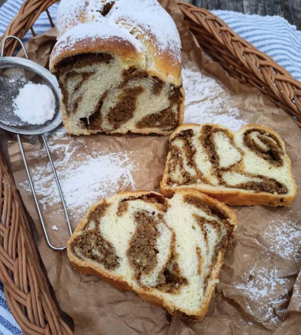Testo podelite na tri dela i svaki deo rastanjite u pravougaonu koru. Premažite filom, pa uvijte u rolnicu. Svaku rolnicu još malo razvucite u dužinu i napravite pletenicu. Prebacite u kalup obložen pek papirom i ostavite da odmara još malo dok se rerna zagreje.