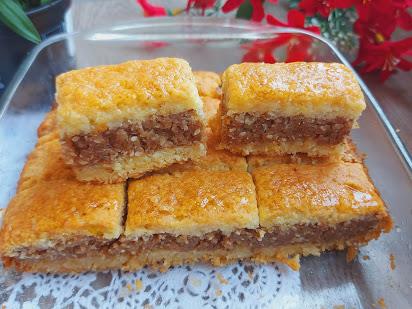 Na foliju razvući fil na veličinu pleha. Preko donjeg dela u plehu staviti razvijen nadev od oraha a preko oraha drugi deo razvijenog testa. Poseći nožem na kocke i peći na 190 stepeni 45-50 min. . Pečen ponovo nožem iseći po sečenim delovima..