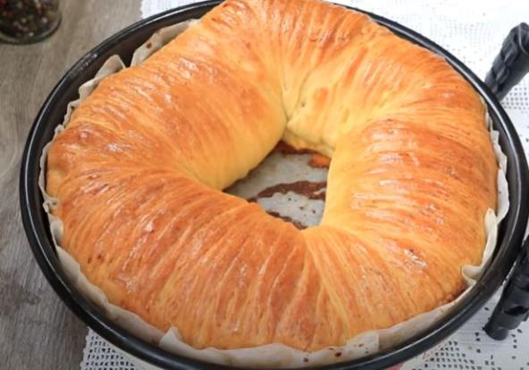 Uviti testo kao kiflu i ređati u podmazan pleh u krug. Sredina ostaje prazna. Odmoriti 20 min. pa premazati žumancetom. Peći na 190 stepeni oko 40 min.