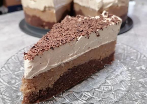 U kalup prečnika 26 cm sipajte prvo čokoaldni deo, lepo rasporedite, pa sipajte deo bez čokolade. Umutite šlag, kapućino i mleko, pa premažite preko kolača.