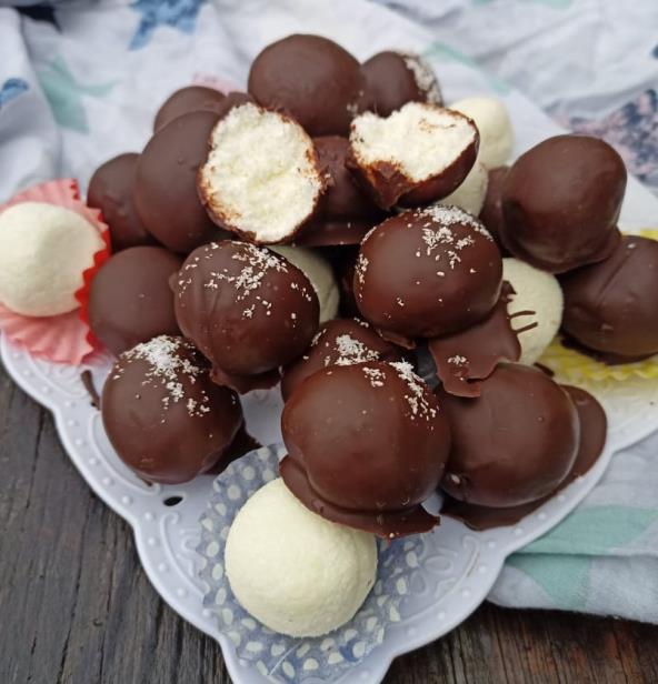 Kokos, šećer u prahu, mleko u prahu izmešajte.Zatim polako dodajte pavlaku tek toliko da se dobije homogena masa. Pravite kuglice, pa ih ređajte na pek papir, koji ste stavili na poslužavnik. Onda rastopite čokoladu sa uljem. Spuštajte jednu po jednu kuglicu u čokoladu, vadite ih viljuškom da se višak ocedi, pa vraćajte kuglice na pek papir. Stavite ih u frižider na kratko da se čokolada stegne.