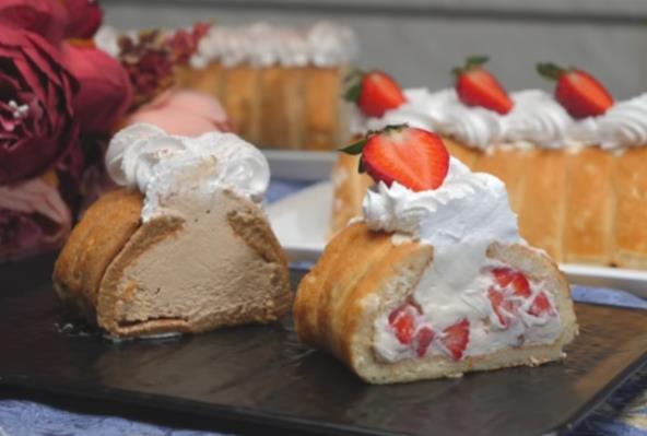 Piškote potapajte u toplo mleko i ređajte u dva reda po 14 komada na foliju. Malo ih stisnite, da se zbiju jedna do druge. Po sredini stavite ceo fil. Uvijte uz pomoć folije, podmećući ruke ispod i savijajući. Stavite u frižider ili zamrzivač nešto duže od sat vremena.