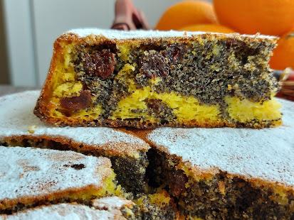 U ostali deo testa dodati mleveni mak, zatim suvo grožđe, malo cimeta i izmešati lagano. Sipati na svetli deo u plehu i rasporediti kašikom.