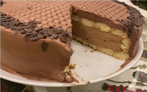 Puter umutite sa prosejanim šećerom u prahu dok smesa ne pobeli, pa postepeno dodajte žumanca. Sve vreme mutite. Otopite čokoladu na pari i dodajte u smesu sa puterom. Dobro sjedinite. Zatim postepeno dodajte šne i lagano mutite. Sipajte preko piškota, poravnajte, pa na vrh poređajte još jedan red piškota koje ste prethodno potopili u mleko. Prekrijte providnom folijom i ostavite da prenoći u frižideru.
