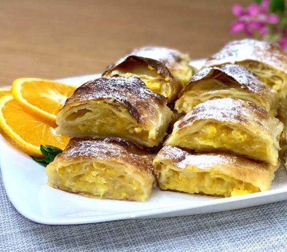 Narandže oguliti i iseckati, staviti u šerpu i dodati ostale sastojke za fil, pa skuvati. Fil za kore umutiti. Mazati filom četiri kore, na četvrtu staviti fil od naradža i uviti u rolat. Ponoviti proces dok ima materijala. Rolate premazati ostatkom fila za kore. Peći na 180 stepeni 20-25min. Prijatno!