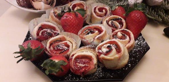 Lisnato testo pospite šećerom, a po želji možete premazati i džemom. Podelite testo na trake po dužini, pa te dugačke trake na pola po širini. Tanko iseckane jagode ređati na testo i uvijati u krug. Peći u kalupima za mafine dok ne porumeni testo. Kada je gotovo posuti šećerom u prahu ili umutiti šlag i ukrasiti.