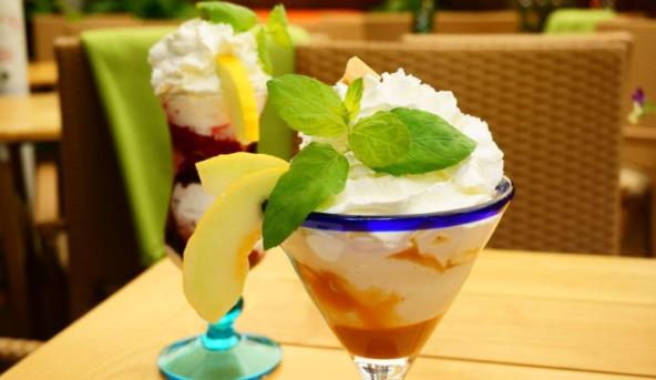 4. Zale đeni kapućino izvaditi pet minuta pre serviranja iz friza, rasporediti preko ragu od jabuka i šlag. Posuti kakaoom, dekorisati po želji i servirati.