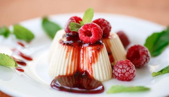 4. Posudice iz frižidera na kratko potopiti u vrelu vodu i onda stegnuti karamel krem izručiti na tanjiriće za serviranje. Oko krema rasporediti voće i po želji servirati ga ukrašenog svežim listićima nane.