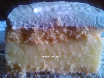 6 belanaca umutiti sa 12 kašika šećera . U umućena belanca dodavati vreo puding i mešati . Na jednu koru izvrnuti celu umućenu masu od pudinga i belanaca i pokriti sa drugom korom. Odozgo ukrasiti šlagom . Prijatno želi Vam najsladji blog