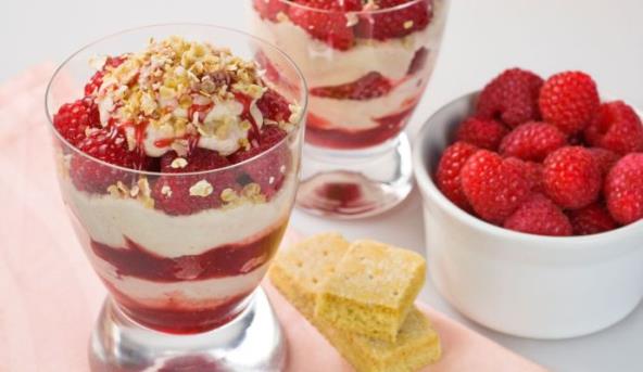 3. Servirati u staklenim čašama za desert i dodati nekoliko celih malina za dekoraciju.