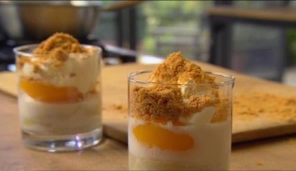 5. Stavite polovinu breskve preko banana. Sipajte šlag preko voća.