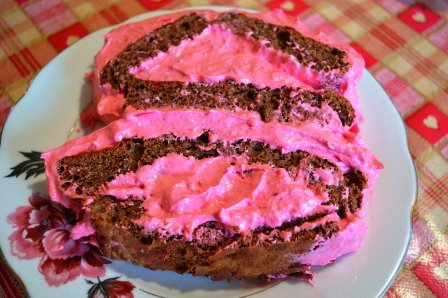 5 jaja, 200g secera + 50g secera, 80 g brasna, 3 kasike kakao praha, 400g jagoda, 250g slag krema od vanile + kasika slaga , crvena prehrambena boja.