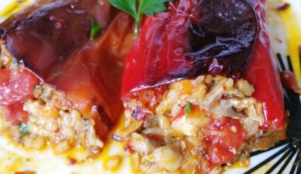 Praziluk iseći tanko, šargarepu izrendati a šampinjone iseći sitnije na listiće. U šerpu sipati 50 ml ulja pa sve to propržiti, dodati pirinač, biber, 1 kašiku ajvara, so i malo začina. Može i seckan peršunov list. Papriku oprati izvaditi seme i drške i napuniti paprike nadevom.