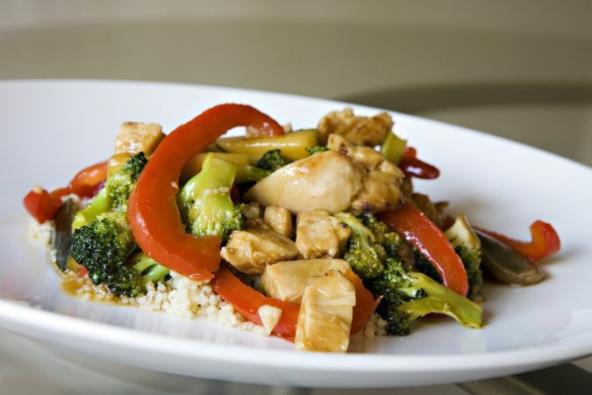 3. Brokoli ocedite tako da tečnost od kuvanja sačuvate. Meso izvadite iz tiganja. U prženi luk i papriku umešajte sok od limuna i 150 ml supe od brokolija, ostavite da se kuva 2-3 minuta, po ukusu posolite i pobiberite. Zgusnite sos razmućenim gustinom, vratite meso i poslužite s kuvanim pirinčem.