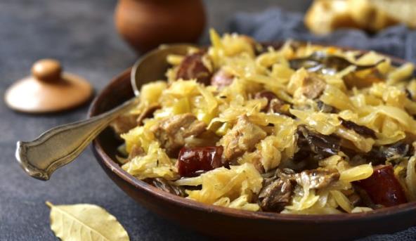 3. Na meso složite kupus, na njega na kriške narezanu glavicu crvenog luka, 2 veće paprike iseckane na kocke, 4 krompira isecite po dubini, 2 manja paradajza na kriške, grubo naseckajte vezu peršuna pa dodajte so, biber, lovor, belo vino i malo ulja.