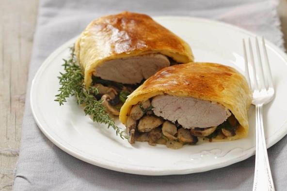 Filete začinite. Tri ploče lisnatog testa stavite jednu preko druge pa ih razvaljajte na dimenzije 20x30 cm. Ugrejte rernu na 200 stepeni. Pečurke očistite i iseckajte. Iseckajte crni i beli luk. Izdinstajte luk na puteru. Dodajte pečurke, pa pecite oko 15 minuta. Odlijte višak tečnosti. Razvucite smesu od pečuraka preko testa, pa preko toga stavite jedan file i urolajte. Polijte s malo vode pa pritisnite. Rolate stavite na podmazan pleh. Žumance umutite sa pavlakom pa time premažite rolate. Pecite ih 40 minuta. Isecite na komade i servirajte.