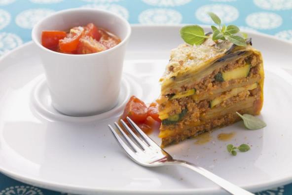 Podmazan pleh napunite mlevenim mesom, prelijte pavlakom i jajima, pa odozgo poređajte kolutove paradajza. Pospite sirom i pecite oko 40 minuta na 180 stepeni.