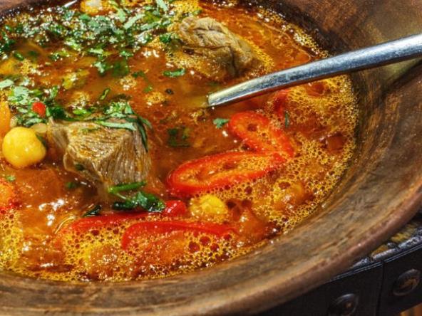Dodajte prženo meso i sipajte toplu vodu, posolite i dodajte zrna bibera i lovorove listove, pa kuvajte na tihoj vatri dok meso ne omekša i dodajte preostali luk, isečen na polumesece.