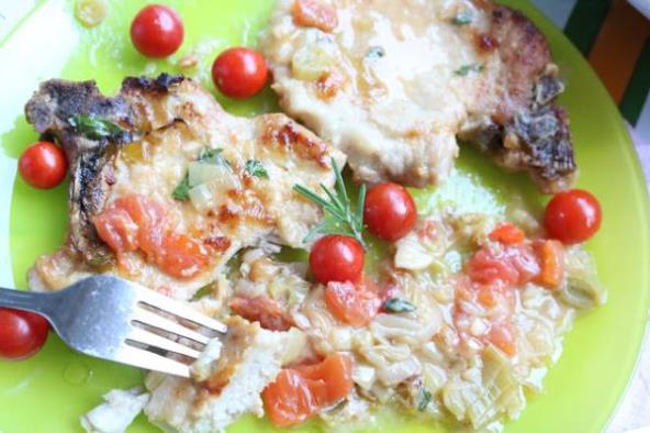 Na ulju propržiti praziluk na kolutove, dodati papriku i oljušten paradajz na koscice pa ga krčkati da omekša.